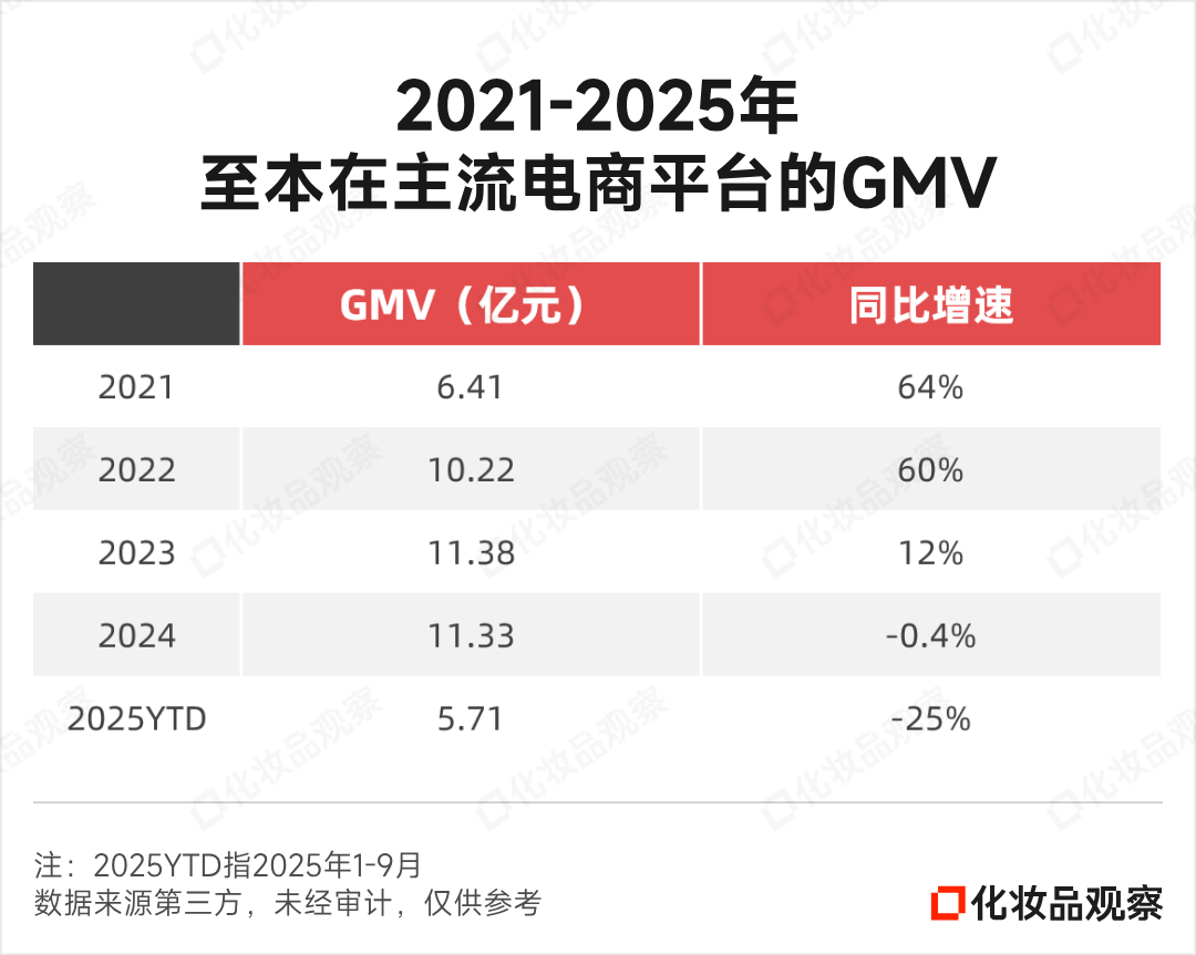 但2025年1-9月,至本在天猫、京东的GMV均有双位数的同比下滑;在抖音的虽有双位数增长,但体量仅在千万级。