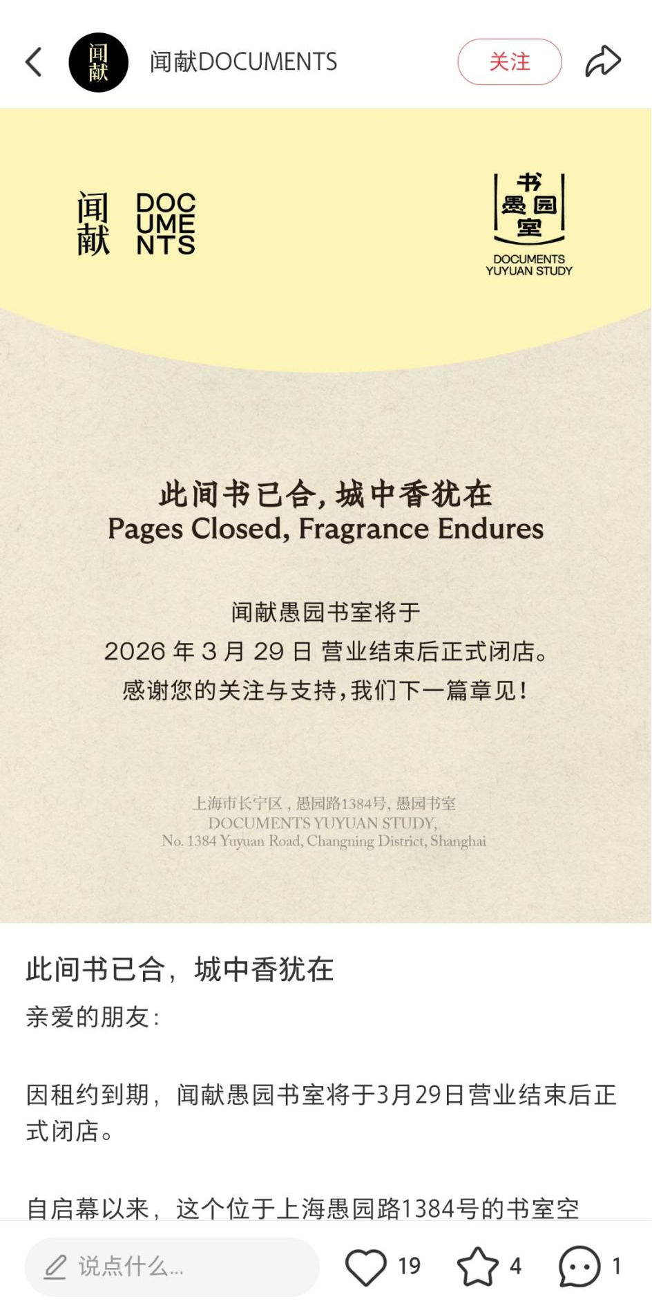 3月23日,闻献官方账号发布消息:位于上海愚园路1384号的闻献愚园书室,将于2026年3月29日营业结束后正式闭店。