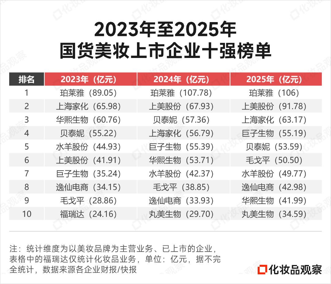 《化妆品观察》整理制得《2023年至2025年国货美妆上市企业十强榜单》。