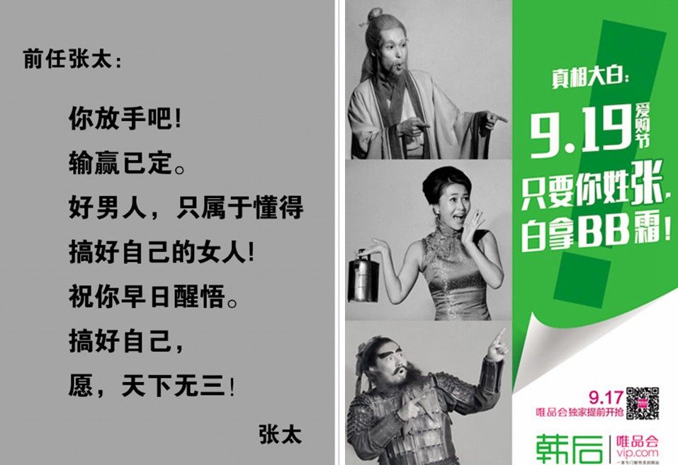 去年是“张太体”,要让“天下无三”。今年,韩后919爱购节喊出的口号是“只要你姓张,白拿BB霜”。当然,核心诉求还是“搞好自己”。