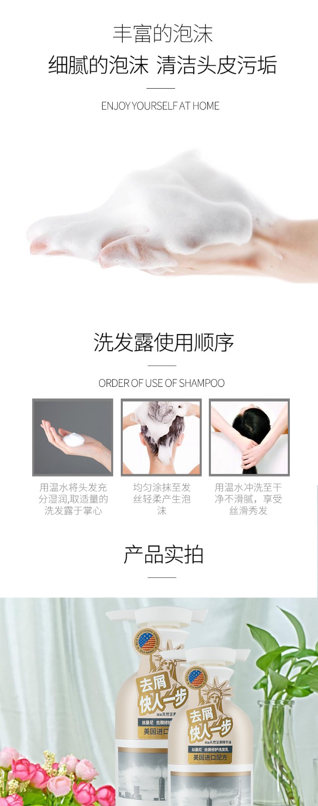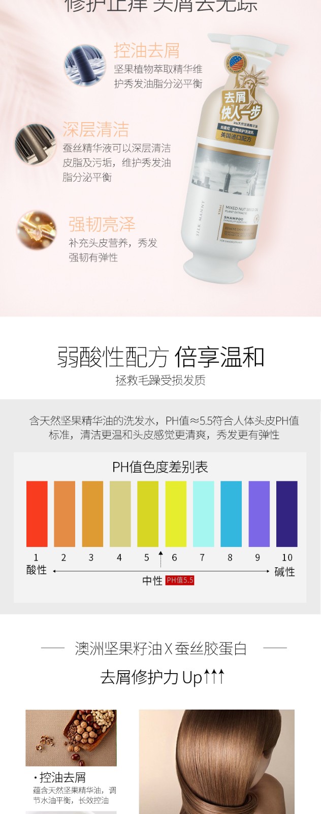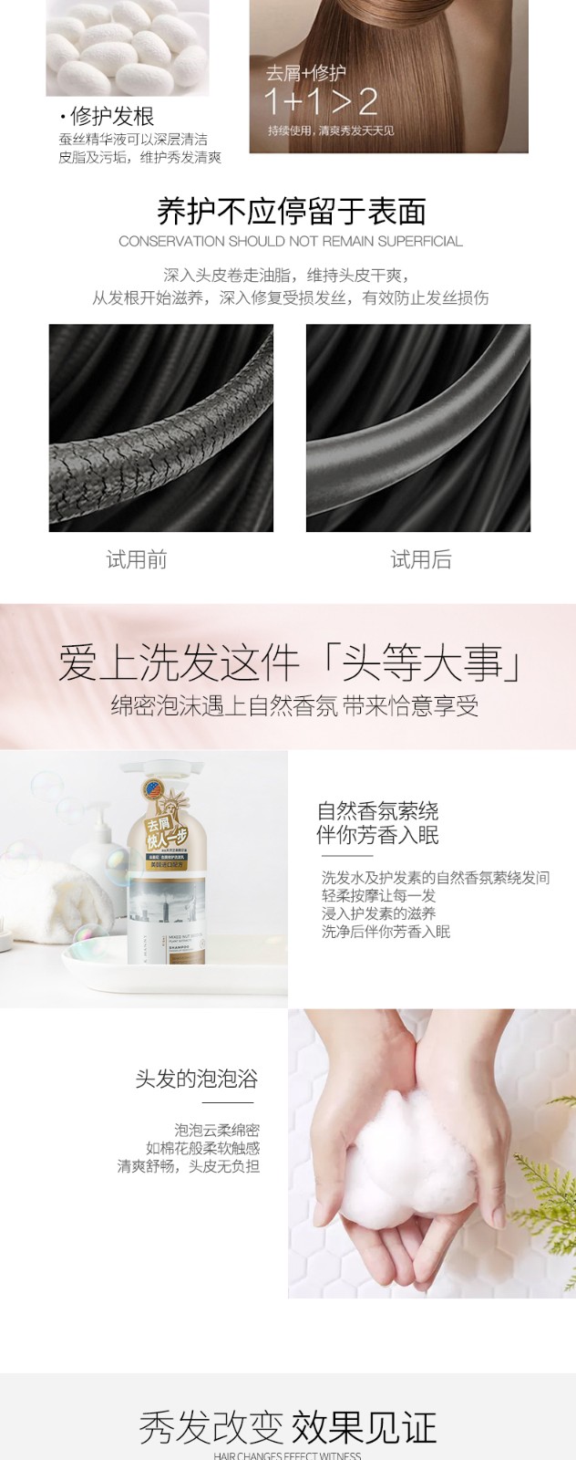 主打产品包括去屑修护洗发乳、清爽控油洗发乳、轻柔丝滑洗发乳和坚果油修护护发精华素。