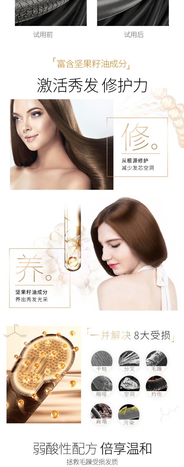 主打产品包括去屑修护洗发乳、清爽控油洗发乳、轻柔丝滑洗发乳和坚果油修护护发精华素。