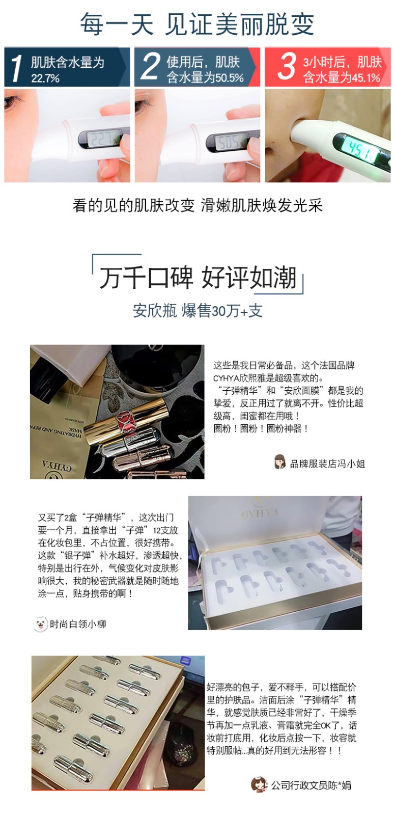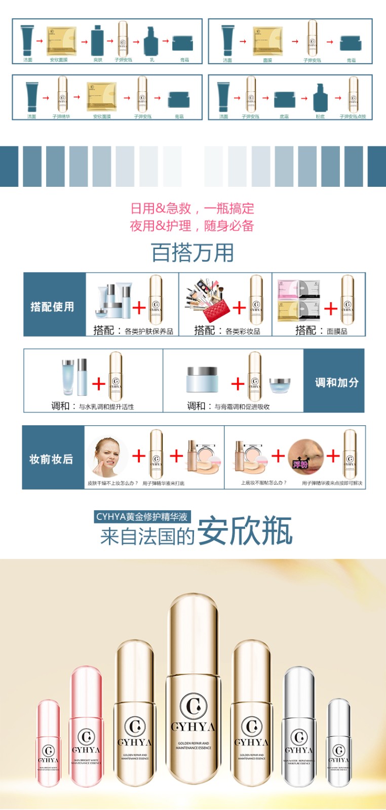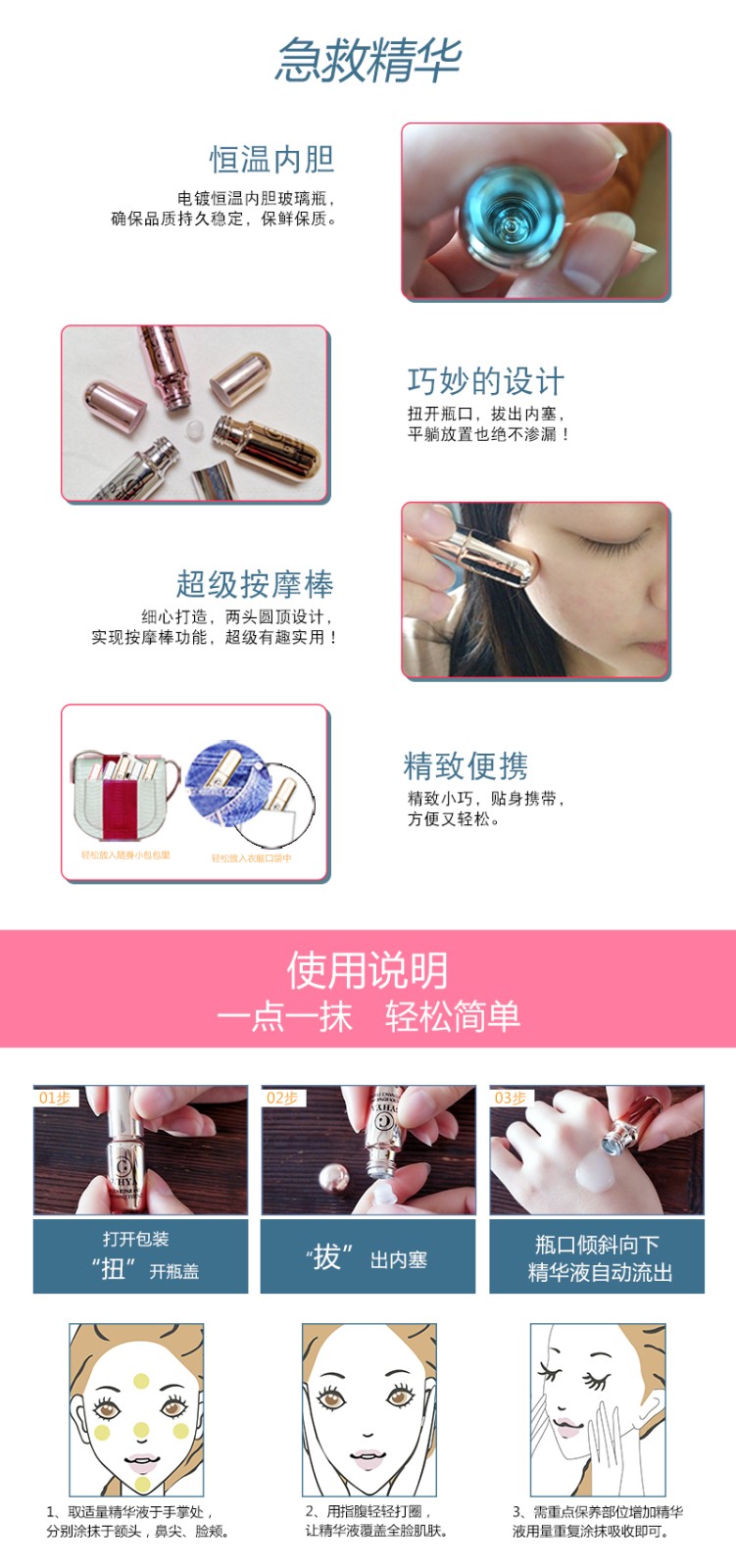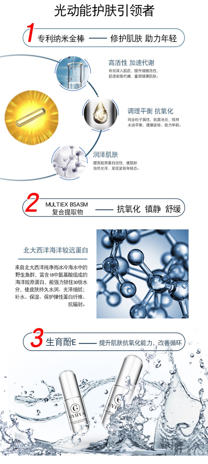 最具特色小瓶“子弹精华”液,首创小巧精致的恒温内胆电镀“安欣瓶”,独有“光动能护肤”技术,修复滋养、保湿抗衰、促进细胞活力新生,引领精华液新风尚。