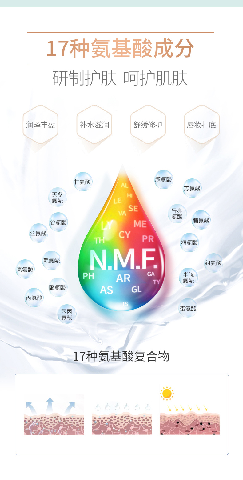 主打氨基酸类护肤品,产品涵盖面膜、手膜、脚膜、眼膜、爽肤水、颈霜、防晒、润唇膏、洁面、乳液等。